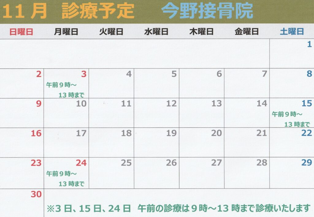 11月3日文化の日、15日土曜日、24日勤労感謝の日振替休日は午前9時〜午後1時まで診療いたします。