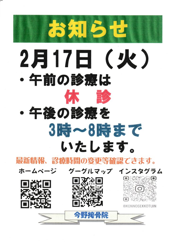 お知らせです 2026年2月13日 最終更新日時 : 2026年2月13日 Konno 2月17日火曜日・午前の診療は休診 ・午後の診療を3時~8時までいたします。※急患、ご用の方はメールにてご連絡いただければ可能な限り対応いたします。