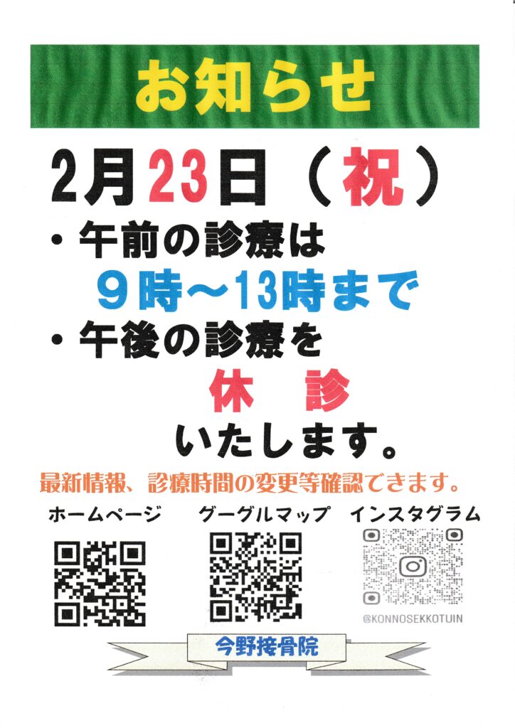 お知らせです 2026年2月20日 最終更新日時 : 2026年2月20日 Konno お知らせです2月23日祝・天皇誕生日は午前9時~13時まで診療いたします。平日なかなか来られない方もこの機会にお身体のメンテナンスをいかがですか‼※急患、ご用の方は診療時間外でもメールにてご連絡いただければ可能な限り対応いたします。
